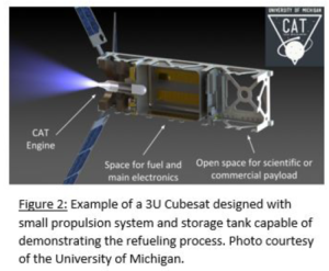 If the “asteroid” is not of a G subtype, or does not prove to contain enough extractable hydrated minerals, then LEO Speedwagon will partner with California Pol ytechnic State University’s (San Luis Obispo, California) Cubesat or Polysat Team to develop a 3U (10 cm x 10 cm x 30 cm) cubesat (Figure 2). This cubesat will contain a partially-filled, small (1 kg) propellant tank to emonstrate the refueling process. The propellant tank will have enough fuel to conduct maneuvers to rendezvous with the refueling platform (to be